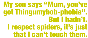 with her blank white sockets, taking no notice at all. My son says “Mum, you’ve got Thingumybob-phobia”. But I hadn’t. I respect spiders, it’s just that I can’t touch them. It was really quite irrational. Anyway, there I was, me and it. And no way out. With the lock jammed, and my husband out, I just had to deal with it on my own.